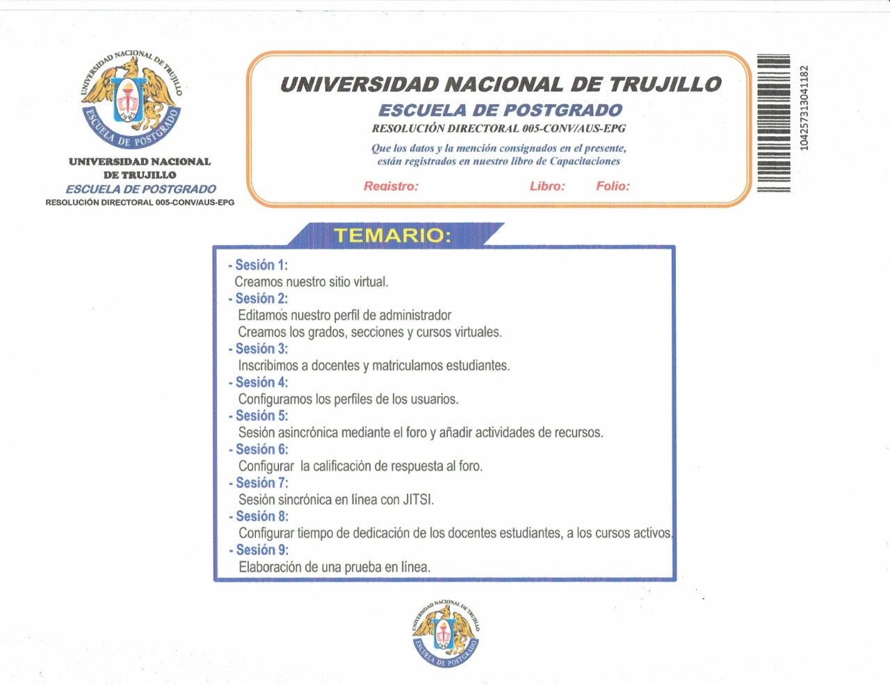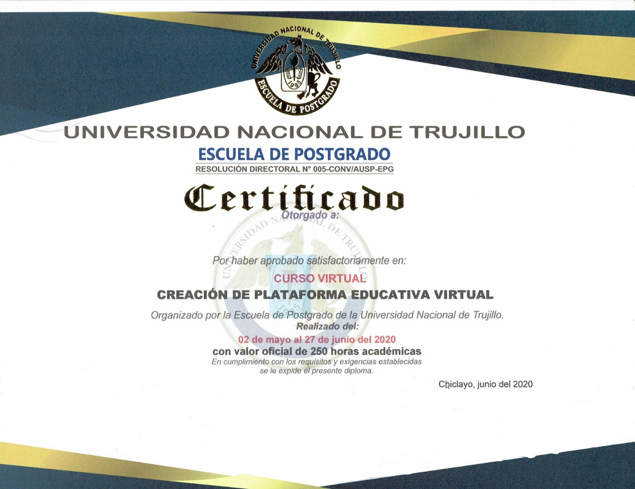 Se hace de conocimiento a los participantes del curso de CREACIÓN DE PLATAFORMA EDUCATIVA VIRTUAL, que en mérito al convenio realizado con la Escuela de Postgrado de la Universidad Nacional de Trujillo, los participantes podrán acceder a certificación oficial del curso por un total de 250 horas académicas a un costo de S/. 80,00 (ochenta soles) más Gastos de envío S/. 15.00 ( Quince soles a todo el Perú).